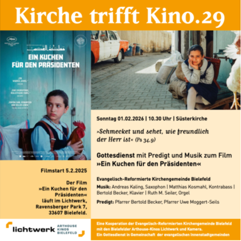 Sonntag, 01.02.2026 Letzter So. n. Epiphanias Süsterkirche 10.30 Uhr Gottesdienst "Kirche trifft Kino" mit Predigt und Musik zum aktuellen Kinofilm "Ein Kuchen für den Präsidenten" Andreas Kaling, Saxophon; Bertold Becker, Klavier; Matthias Kosmahl, Kontrabass; Ruth M. Seiler, Orgel; Pfarrer Bertold Becker, Pfarrer i.R. Uwe Moggert-Seils Kollekte: Arbeit des Stadtkantorates