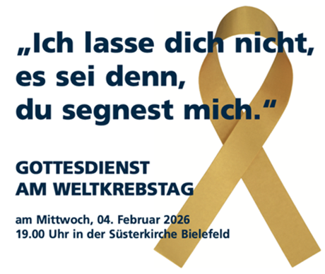 Mittwoch, 04.02.2026 Süsterkirche 19.00 Uhr Ökumenischer Hoffnungs- und Segnungsgottesdienst am Welt-Krebs-Tag "Ich lasse dich nicht, du segnest mich denn" Pastorin Britta Mailänder, Pastor Peter Schäfer, Pfarrer Bertold Becker Kollekte: besondere seelsorgliche Dienste
